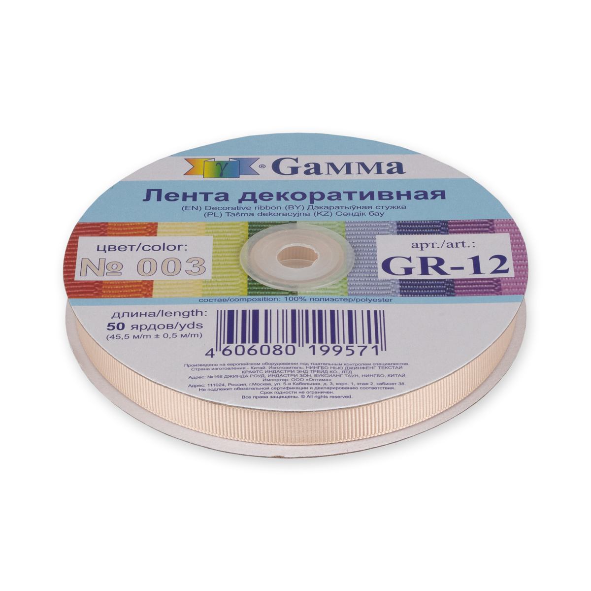 Тесьма декоративная "Gamma" репсовая GR-12 12 мм 1/2 " №003 св. бежевый 45.5 метров