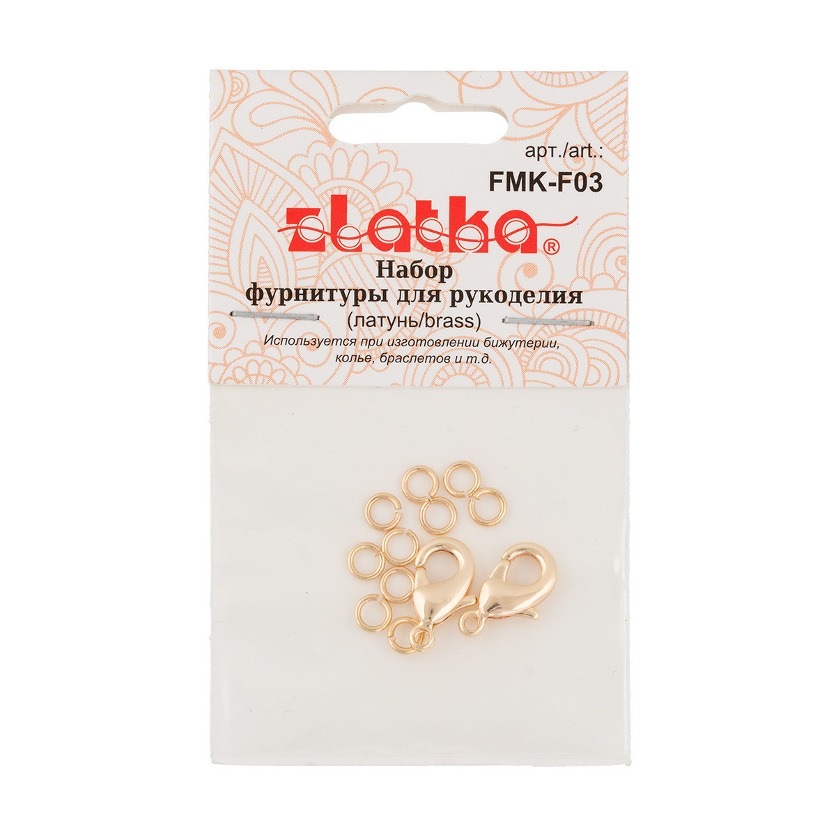 Набор фурнитуры " Zlatka" FMK- F03 для создания бижутерии. Содержит в себе детали для создания украшения: кольца 10 шт диаметром 4 мм; замки 2 шт размером 12 мм; Состав: латунь. Использование качественной фурнитуры играет очень важную роль при изготовлении бижутерии. Сообщить о неточности в описании